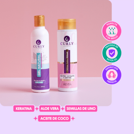 3. Gel Curly Lovers a base de semillas de lino, aloe vera, vitamina e y coco que define, activa, nutre, da brillo, y duración a la definición