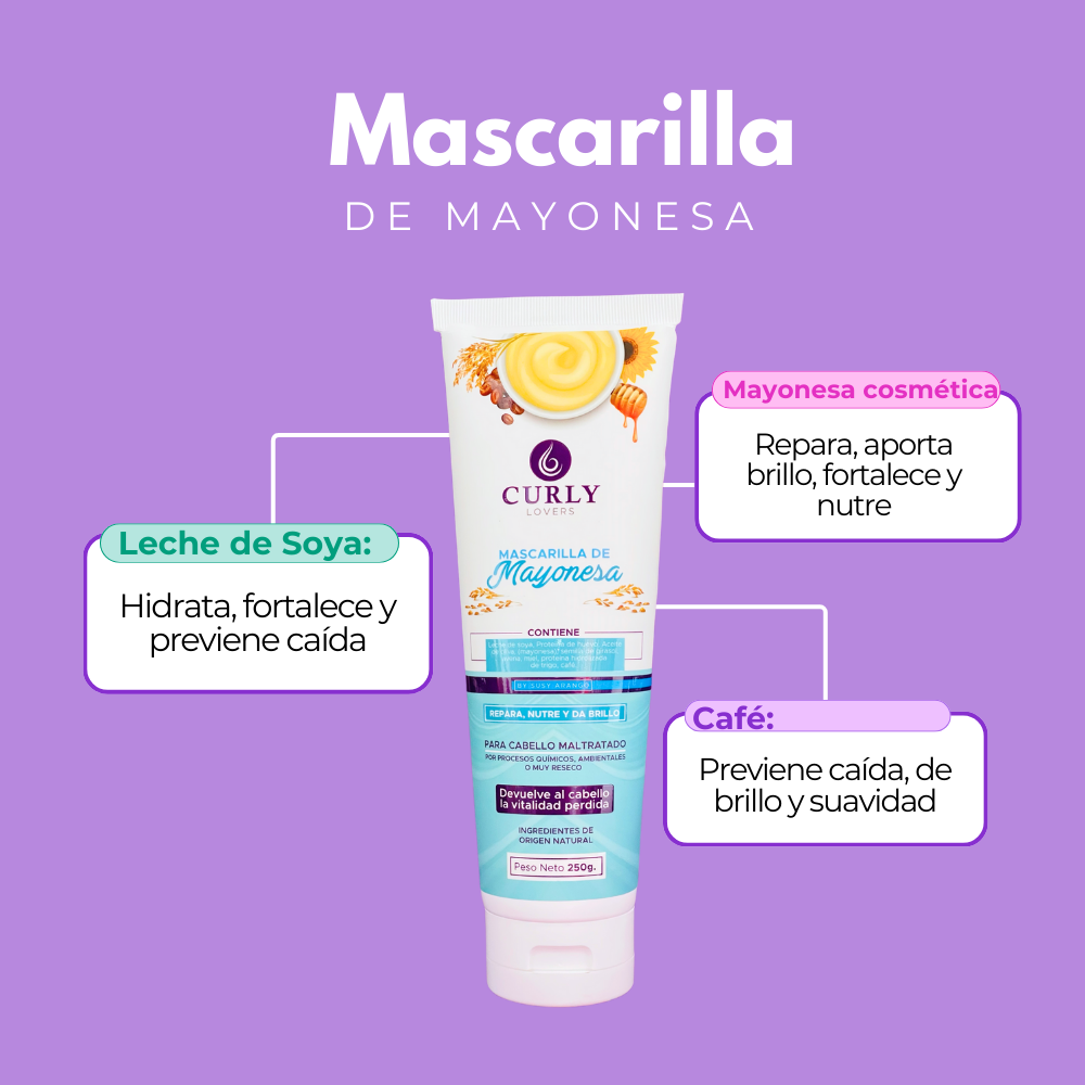 La Mascarilla de Mayonesa Curly Lovers es un tratamiento intensivo que devuelve la vitalidad, aporta brillo, nutre profundamente, previene la caída y fortalece tu cabello gracias a su rica combinación de ingredientes naturales.